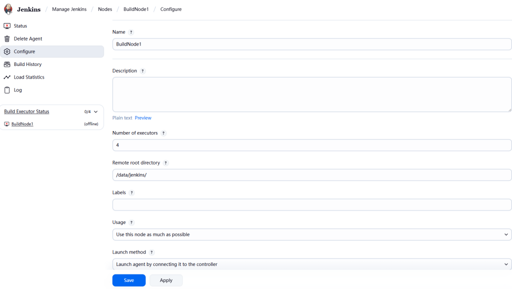 Number of executors(执行器数量):此值决定了该节点上可以同时执行的最大构建任务数量(即并发构建数)。每个执行器实质上是 Jenkins 在该节点上管理的一个独立执行单元(通常表现为一个线程)。默认值为 1,你可以根据节点的硬件资源(如 CPU 核心数)进行调整,允许在单个节点上运行多个执行器以提高并发处理能力。