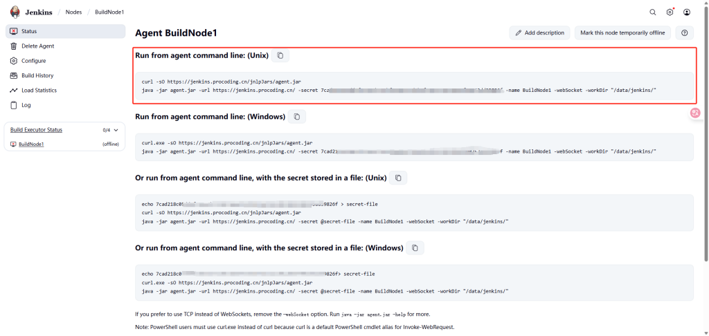 java -jar /data/jenkins/agent.jar -url https://jenkins.procoding.cn/ -secret 7cad*******************39826f -name BuildNode1 -webSocket -workDir "/data/jenkins/"