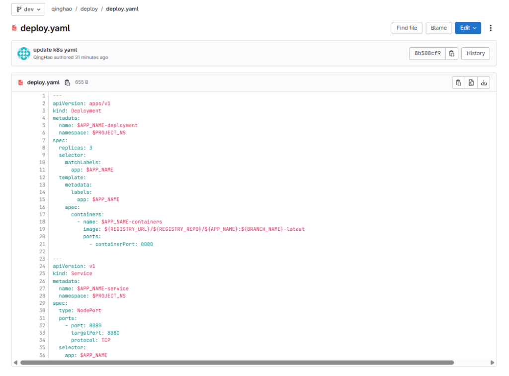 脚本分三阶段:代码克隆 → 镜像构建推送 → K8s 部署。结构清晰,支持按分支区分处理逻辑。详见脚本,需注意: