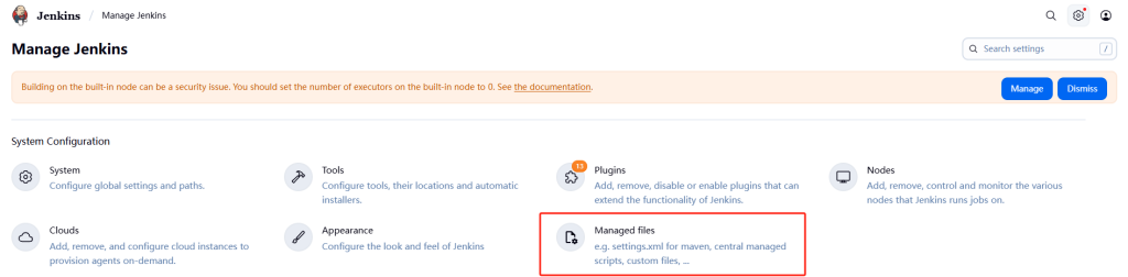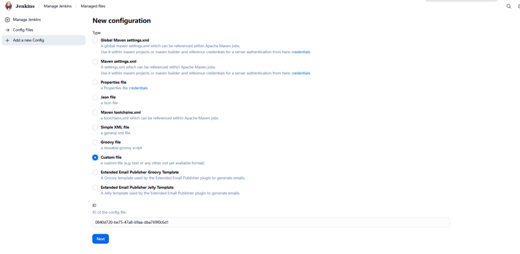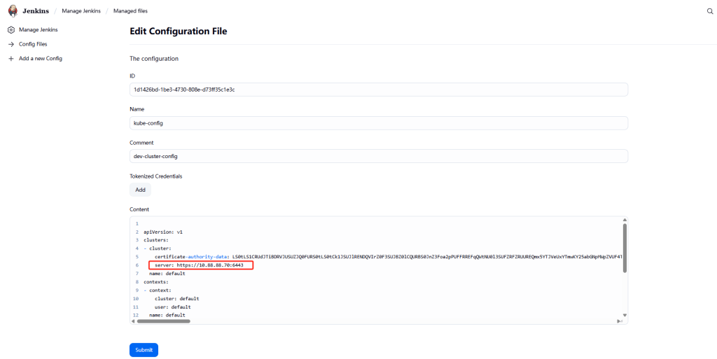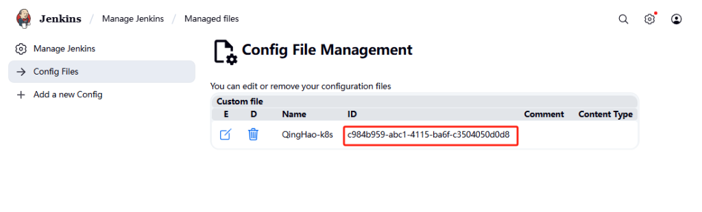 在 Manage Jenkins -> Managed Files 添加 .kube/config,类型选择 Custom file。