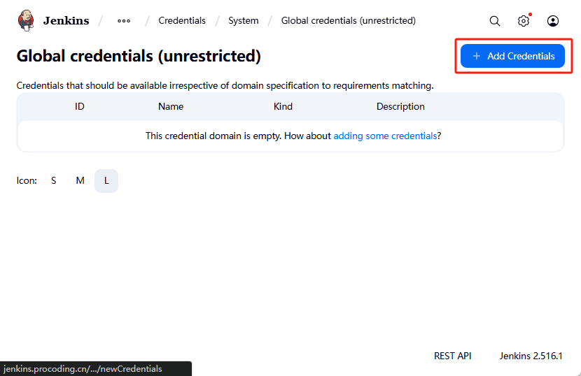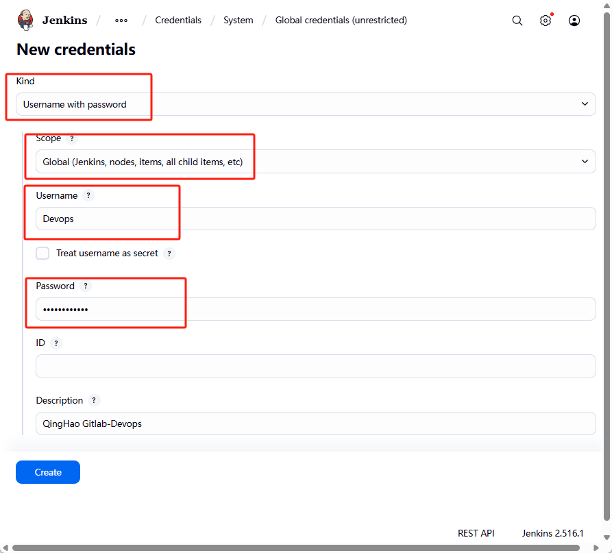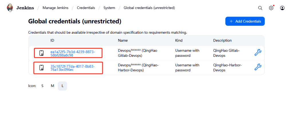 在 Manage Jenkins -> Credentials 中分别添加 GitLab 和 Harbor 的账号密码,记录凭据 ID 用于流水线中调用。