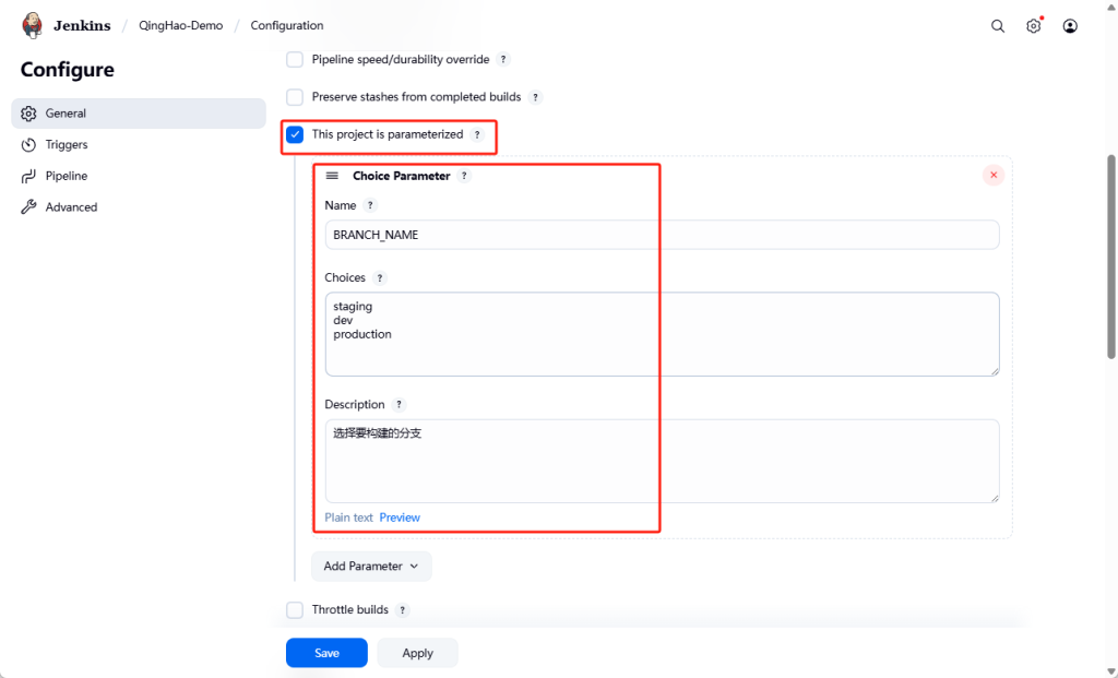 勾选 This project is parameterized,添加构建参数BRANCH_NAME:用于dev/staging/production分支选择。
