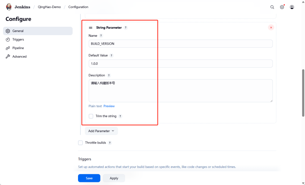 添加构建参数BUILD_VERSION:用于版本号输入。