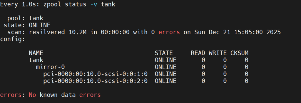 pool: tankONLINEmirror-0两块盘都 ONLINEscan: resilvered 10.2M ... with 0 errors:重建完成且无错误errors: No known data errors