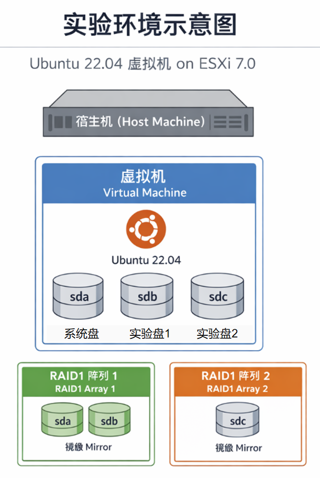 磁盘:sda为系统盘,sdb、sdc为实验盘(16GB),其中sda、sdb挂载在宿主机RAID1阵列1下,sdc挂载在宿主机RAID1阵列2下。