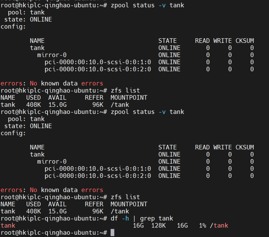 应该能看到 tank 的 mirror-0 两块盘都处于 ONLINE 状态,且 /tank 正常挂载。