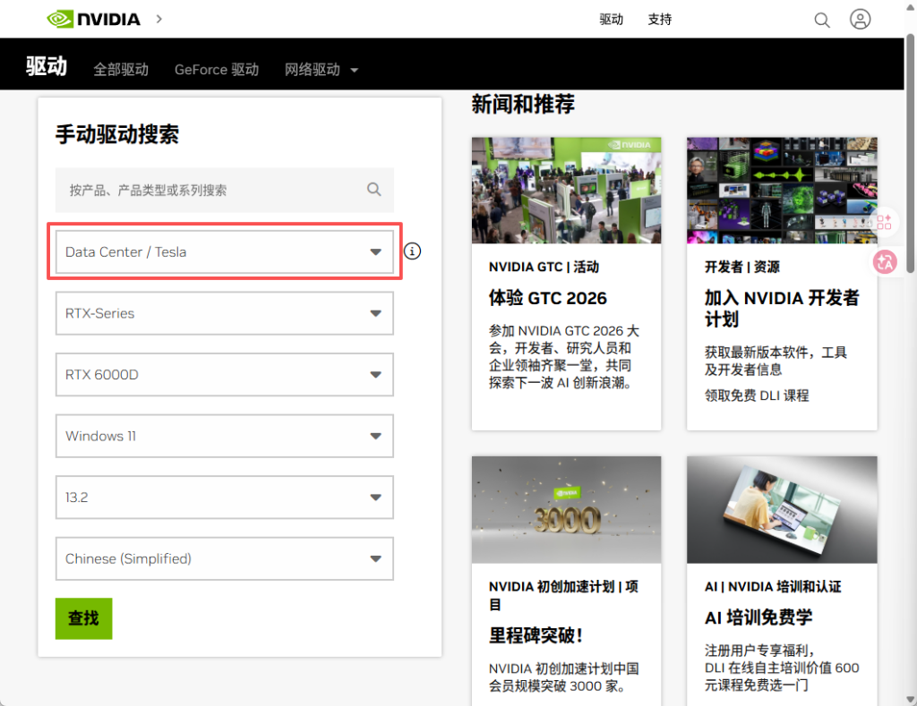 Windows需要下载数据中心版驱动,地址:https://www.nvidia.cn/drivers/