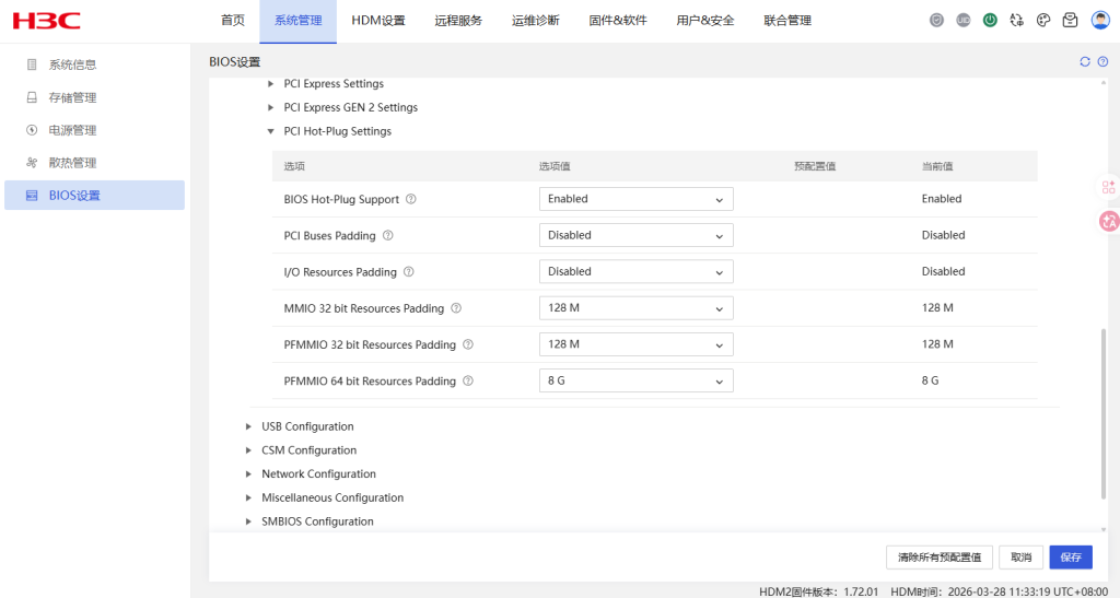 update-initramfs -u -k allBIOS 关键操作: 重启物理机,进入 BIOS 或 BMC -> Advanced -> PCI Hot-Plug Settings。 将 PFMMIO 64 bit Resources Padding 设置为最大值(如 512G 或 1T),保存重启。dmesg 中 no space 红字消失即为成功。